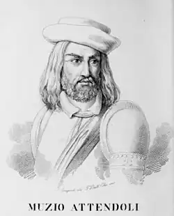 Later, together with his brothers Bosio, Francesco and Bartolo and two cousins, Muzio joined the company of Alberico da Barbiano, who nicknamed him "Sforza" ('Strong').[2] In 1398 he was at the service of Perugia against the Milanese troops of Gian Galeazzo Visconti, to whom Muzio soon switched his loyalty following the typical behaviour of mercenary chieftains of the time.[3] Later Muzio fought for Florence against Visconti but in 1402, at the Battle of Casalecchio, was defeated by his former master Alberico da Barbiano.[4] By 1409, he was in the employ of Niccolò III d'Este of Ferrara, who was being menaced by Ottobono Terzi of Parma.[4]