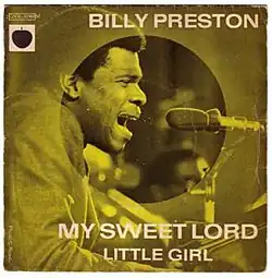 Reviewing the single for Rolling Stone, Jon Landau called the track "sensational".[116] Billboard's reviewer described the record as "a powerhouse two-sided winner", saying that "My Sweet Lord" had the "potent feel and flavor of another 'Oh Happy Day'", with powerful lyrics and an "infectious rhythm".[117] Record World called it "a haunting inspirational hare krishna chant-song to a tune reminiscent of the Chiffons' 'He's So Fine.'"[118] Ben Gerson of Rolling Stone commented that the substituting of Harrison's "Hare Krishna" refrain for the trivial "Doo-lang, doo-lang, doo-lang"s of "He's So Fine" was "a sign of the times"[119] and recognised Harrison as "perhaps the premier studio musician among rock band guitarists".[92][nb 8] In his December 1970 album review for NME, Alan Smith bemoaned the apparent lack of a UK single release for "My Sweet Lord". Smith said the song "seems to owe something" to "He's So Fine",[120][121] and Gerson called it an "obvious re-write".[119]