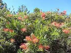 A range of methods were used at Myall Park to provide successful raising and growing conditions, including the preparation of special growing beds, and experiments with soil structure and composition.[45] The influence of Gordon's father was evident in the layout of the garden, through the practice of planting in clumps rather than lines. The garden was organised into divisions and Gordon methodically planted as much of a genus as was available together in the garden. Beyond aesthetic and environmental benefits, this planting method was also a way of encouraging natural hybridisation. The genus Grevillea had been a focus during plant collecting trips and in 1963 a new Grevillea hybrid appeared in the garden. Displaying the low growing characteristics of the Grevillea bipinnatifida, together with the vibrant flame coloured flowers of the G. banksii, and the ability to flower throughout the year and attract birds, the hybrid featured highly desirable attributes for gardeners. Gordon named the hybrid Grevillea 'Robyn Gordon' after his eldest daughter (who died aged 16 from illness in 1969) and distributed it freely to nurseries in Brisbane and Sydney, without payment. Three other hybrids were also produced at Myall Park. The first two were named after the Gordon's other daughters, Grevillea 'Sandra Gordon' (also a popular garden plant) and G. 'Merinda Gordon'.[1][46][47][48] The third was discovered much later in the early 2000s and was named Grevillea 'Dorothy Gordon' after Dave Gordon's wife.