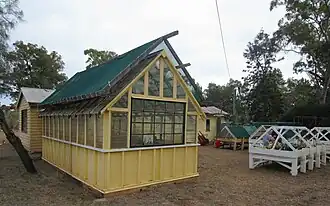 Gray's work at Myall Park focussed on seed raising, with planting and watering work in the garden the responsibility of Gordon. While Gray was working at Myall Park the infrastructure to support the functions of the garden were improved. Drawing on his prior experience, Gray designed suitable nursery structures. According to Gordon, he built for Gray the types of structures that the Victorian Government would not supply for him at Wail in Victoria.[36] The nursery consisted of a single-storey timber building with a potting room and a seed storage room, connected by a covered entry to a timber-framed glasshouse/misting room with a concrete slab floor. The timber building was constructed first and the glasshouse was a later addition. A yard to the rear of the buildings housed four large timber hardening bays. The nursery was built by Harry Howe, with the assistance of cabinetmaker Bill Dunmall, who fitted out the vermin proof seed storage room with silky oak cabinet drawers. Cypress pine milled on the property was used in the construction of the buildings. A catalogue system was used to record seed source and date, supplier and usage. Details of propagations, planting locations and survival rates were all recorded. Around this time a large single room, lined with tall cupboards and work benches was constructed at the Gordon family residence house, to provide an art space for Dorothy and to store herbarium specimens. The house is now located within the Myall Park pastoral property, just outside the Botanic Garden boundary.[30][37][38][39] The herbarium specimens formerly located in the house are now held by the Myall Park Botanic Garden.[1]
