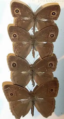 From Kathlekan, in Mysore, there is in the British Museum Collection a series of what I take to be a variety of this form. The specimens (all males) belong to the dry-season form. They are uniformly smaller than typical perseoides, and differ on the upperside of the forewing in the very broad pale iris surrounding the median ocellus, and on the underside of the same wing in the margin of the darker basal portion of the wing being prominently concave just above the dorsal margin. The male sex-mark on the underside of the forewing is larger than that of M. mineus but resembles it in colour. I have been unable to separate even as a variety M. intermedia, Moore, from M. perseoides, Moore.[1]
