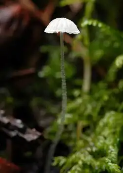 The cap is white and small, with a diameter typically ranging from 2.5 to 7.5 mm (0.1 to 0.3 in). Initially convex to cucullate (hood-shaped), it flattens during maturity, developing visible surface grooves that correspond to the gills underneath the cap; the surface may also be covered with glistening particles, remnants of the partial veil.[16] The cap is pallid gray with a whitish margin when young, but soon becomes white overall. The flesh is membranous, fragile, and thin (less than 0.5 mm). The gills are free from attachment or narrowly attached (adnexed) to the stem.[17] They are up to 0.5 mm broad, distantly-spaced (usually numbering between 7 and 12), and sometimes adhering to each other to form a slight collar (a pseudocollarium) around the stem. They are translucent-white throughout their development, with a fringed, white edge.[18] The hollow stem is 0.5 to 2 cm (0.2 to 0.8 in) long, and usually curved and threadlike. The bottom of the stem is enlarged into a slight bulb, which is initially nearly spherical.[17] At the very base of the stem is a small, white, and hairy disk-like base that attaches to the substrate.[19] The edibility of the mushroom is unknown, but like many small Mycenas, they are insubstantial and not likely to be considered for the table.[20]