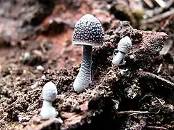 The caps of young mushrooms are initially egg-shaped to conical,[1] expanding to become bell-shaped and up to 2 cm (0.8 in) in diameter. Initially, the margin of the cap is rolled inwards; it typically assumes a lighter color than the centre of the cap surface. Dark brown in color, the mushroom is distinguished by the presence of white speckles or scales on the cap and stem; these scales may disappear when they become sloughed off or washed away by rain, which can make the species hard to recognise.[5] The thick gills have an adnate attachment to the stem (broadly attached to the stem slightly above the bottom of the gill, with most of the gill fused to the stem), and are white to light grey in colour, paler toward the edge. There are about 24–28 gills extending completely from the cap margin to the stem, and one or two tiers of lamellulae (shorter gills does do not extend fully from the margin to the stem).[1] The thin stem is up to 4 cm (1.6 in) high and 0.3 cm (0.12 in) wide, and does not have a ring.[2] Young specimens will typically have whitish scales at the base; later, these will slough off and a felt-like whitish mycelium may be apparent. The mushroom have no distinctive odour.[1] The spore print is white[2] or cream.[3] The edibility of the mushroom has not been reported.