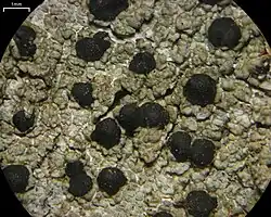 | Closeup of the lichen Mycoblastus sanguinarioides; scale bar is 1 mm | |