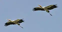By the age of three months, the previously feathered head is now completely bald and the dull bill has become warm yellow with a greenish yellow tip.[4][13] Both features are characteristic of adults. Milky stork juveniles appear almost identical to painted stork juveniles,[14] but are said to be distinguishable from painted stork juveniles by their paler underwing lining contrasting with the completely black flight feathers, whereas this underwing lining is completely black in painted storks.[4]