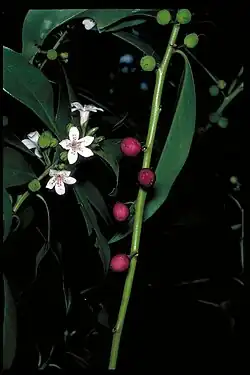 The flowers appear in groups of 3 to 6 in the axils of the leaves on the end of flattened stalks 6.5–11 millimetres (0.3–0.4 in) long. They have 5 lance-shaped sepals and 5 petals joined at their bases to form a tube. The tube is 4–6 millimetres (0.16–0.24 in) long and the lobes are about the same length as the tube. The tube is white, spotted purple on the lobes and inside the tube and the inside of the tube is hairy. There are 4 stamens which extend slightly beyond the petal tube. The fruit is an oval-shaped, reddish drupe.[2]