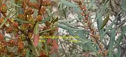 M. cerifera is an evergreen. The glandular leaves are long, have a leathery texture and serrated edges, and contain aromatic compounds.[4] The plant is dioecious, with male and female flowers borne in catkins on separate plants.[3] Male flowers have three or four stamens, and are surrounded by short bracts.[4] The female flowers develop into fruit, which are globular and surrounded by a natural wax-like coating. The species flowers from late winter to spring, and bear fruit in late summer or fall.[4] No endosperm is present in the seeds. M. cerifera can also reproduce clonally through runners.[6]