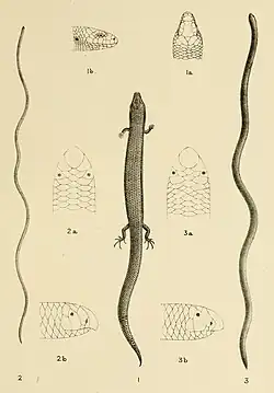 An illustration of Myriopholis macrura, and the other Socotran reptiles Parachalcides socotranus and Myriopholis filiformis. 3 is M. filiformis, 3a and 3b views of its head.