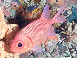 Myripristis hexagona, the doubletooth soldierfish, is a nocturnal species of soldierfish from the genus Myripristis. It is light red to yellowish in colour, and grows to a maximum length of 30 cm (11.8 in). It can be found in the Indo-Pacific region, from East Africa to Samoa, north to the Ryukyu Islands, Japan, and south to the Great Barrier Reef and New Caledonia. However, it has not been found on low islands or atolls in the Indo-Pacific region.[2] It is found at depths of 3–40 metres (9.8–131.2 ft) and inhabits sheltered coastal and offshore reefs, typically in turbid areas of bays or lagoons. During the day, it hides in caves or beneath ledges, while at night, it feeds on plankton. It can be found in loose aggregations, sometimes with other species of soldierfish.[3]