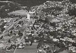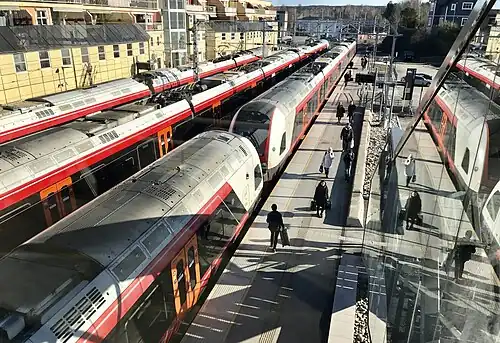 A grain elevator was built next to the station in 1953.[13] The line was electrified on 5 December 1958. This allowed for the retirement of steam locomotives and the closing of the roundhouse. At the same time direct services to the capital were reintroduced.[14] An interlocking system was installed on 5 April 1968. At a later date, all ticket sales were transferred to the Narvesen kiosk at the station.[5]
