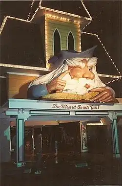 The Fun House consisted of 15 areas called "chambers", including a mirror maze, a rolling barrel, crawl-through tunnels, scary jail areas, a moving bridge and a crooked room. In the early days, there was a multiplex movie theater, a hologram machine, a Disco room with a lighted dance floor, the moon room, and a wall-sized "computer" that could read patrons' handwriting and provide fortunes. There was also a show about three quarters of the way through the Fun House with music, lights, special effects and a video of the Wizard projected on a large screen.