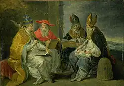 He is celebrated not only as a contemplative but also as a theologian and Father of the Church, a title given to him in a document of the Fifth Ecumenical Council, held in Constantinople in 553, which declared that it followed his teaching on the true faith "in every way".[42] Another document of the same ecumenical council speaks of Augustine as "of most religious memory, who shone forth resplendent among the African bishops".[43]