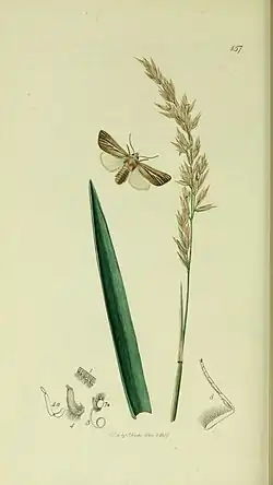 Larva reddish yellow; dorsal line fine, pale with dark edges; subdorsal lines blackish; spiracles black on a pale lateral stripe; head and thoracic plate yellowish. The larvae are monophagous, feeding exclusively on marram (Ammophila arenaria) leaves, a plant that grows on dunes along the shoreline.[4]