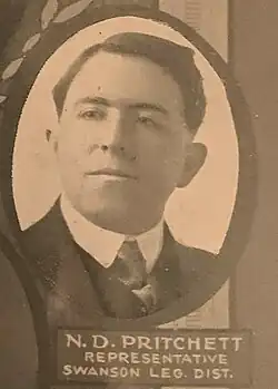 In 1913, Pritchett was the Secretary for the Snyder, Oklahoma local of the Socialist Party of Oklahoma.[1] Pritchett ran for the Oklahoma House of Representatives as the Socialist Party's nominee in 1914. After winning the election, he was the first third party nominee for Speaker of the Oklahoma House of Representatives.[2] During the 5th Oklahoma Legislature's special session, he wrote multiple columns for the Otter Valley Socialist proposing usury limits and supported various attempts at reform, but did not vote for that sessions final usury reform bill which increased the maximum interest rate to 15% on loans over $100.[3]