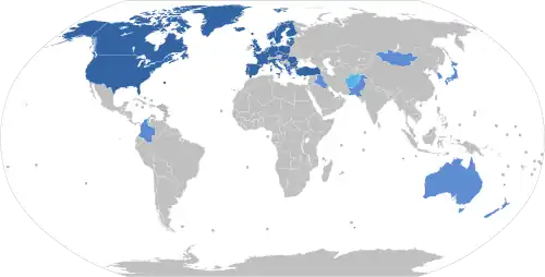 NATO global partners, or partners across the globe[1] are countries that cooperate with NATO on a regular basis, but are unable to join the alliance due to Article 10 restricting countries eligible to join the alliance to those in Europe.[2]