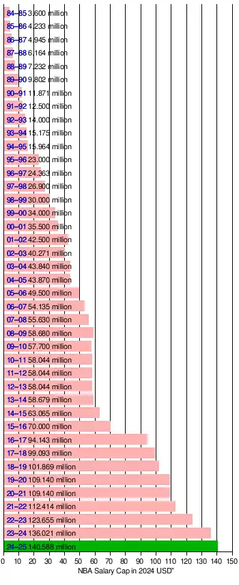 The NBA salary cap is the limit to the total amount of money that National Basketball Association (NBA) teams are allowed to pay their players. Like the other major professional sports leagues in North America, the NBA has a salary cap to control costs and benefit parity, defined by the league's collective bargaining agreement (CBA). This limit is subject to a complex system of rules and exceptions and is calculated as a percentage of the league's revenue from the previous season. Under the CBA ratified in July 2017, the cap will continue to vary in future seasons based on league revenues. For the 2024–25 season, the cap is set at $140.588 million.[1]
