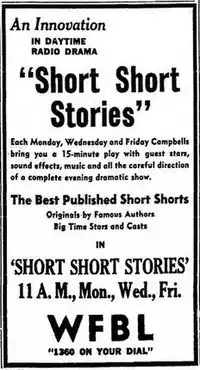 NBC Presents: Short Story is a half-hour American radio program offering dramatizations of contemporary American short stories that began on NBC on February 21, 1951, and ended on May 30, 1952.[1] The primary goal of the series, as stated by script editor Hugh Kemp, was to combat what appeared to be a widespread lack of respect for the short story as a form. "America's serious writers have, by and large, put into their short stories the same kind of penetrating insight that has gone into their widely read novels. [...] In this series we hope to get some of the material off the dusty shelves and out into the homes of the vast audience of radio."[2]