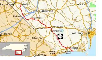 NC 130 was established around 1928 as a renumbering of part of NC 201 between NC 30 in Supply, to the intersection of Moore Street and Atlantic Avenue in Southport. In 1930, NC 130 was extended west along NC 30 to Shallotte, then northwest along new primary routing to NC 23 near Whiteville.[2] In 1940, NC 130 made its final westward extension, by overlapping with US 701 to US 74 in Whiteville; in concurrency, it travels with US 74 until Boardman, then replaced NC 71 through Fairmont and Rowland before ending at US 74/NC 71 in Maxton.[3]