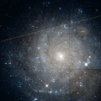 NGC 1058 is a Seyfert Type 2 galaxy in the NGC 1023 Group, located in the Perseus constellation. It is approximately 27.4 million light years from Earth and has an apparent magnitude of 11.82. It is receding from Earth at 518 kilometers per second (322 mi/s), and at 629 kilometers per second (391 mi/s) relative to the Milky Way.