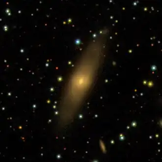 NGC 1250 is an edge-on lenticular galaxy located about 275 million light-years away[2] in the constellation Perseus.[3] It was discovered by astronomer Lewis Swift on Oct 21, 1886.[4] NGC 1250 is a member of the Perseus Cluster.[5]
