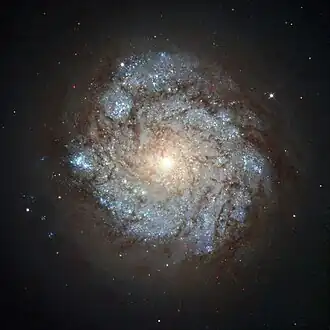 Although it appears nearly face-on, the galactic plane is inclined by an angle of 28° to the line of sight from the Earth, with the major axis being oriented along a position angle of 116°.[3] The outer part of the disk appears to be warped, so that the major axis is not quite perpendicular to the minor axis,[6] and the morphology is somewhat disrupted.[2] The inner disk contains multiple intense star-forming regions.[3] This is taking place in an inner ring with a radius of 6.5 kly (2 kpc) that may have been triggered by a merger with a smaller companion.[4] It has an H II nucleus.[7]