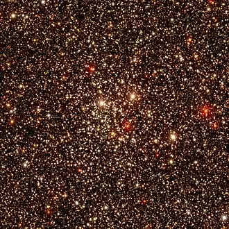 There are 69 probable member stars within the angular radius of the cluster and 39 within the central part of the cluster.[3] Five blue stragglers have been detected in the cluster,[8] and 15 red giants are probable members of the cluster.[6] The earliest main sequence stars are of type A0. One of the stars in the cluster region shows extremely red colour along with blue ultraviolet colour and it could be an interacting binary star.[6] The turnoff point is at 2.6 ±0.1 M☉.[7]