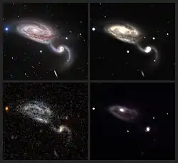 NGC 5395 is an interacting spiral galaxy located at a distance of 160 million light years, but receding away from the Earth at 3511 kilometers (2181.6 miles) per second, in the constellation Canes Venatici. It was discovered by William Herschel on May 16, 1787. NGC 5395 and NGC 5394 are included in the Atlas of Peculiar Galaxies as Arp 84 in the category "Spiral galaxies with large high surface brightness companions".[4][5]