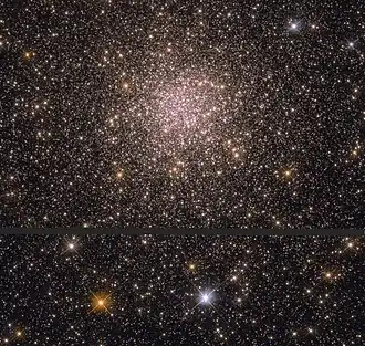 NGC 6316 is a globular cluster located in the constellation Ophiuchus. Its Shapley-Sawyer Concentration Class is III, meaning that it has a "strong inner core of stars" and was discovered by the German-born British astronomer William Herschel on 24 May 1784.[6] It is at a distance of about 37,000 light years away from the Earth.[3] NGC 6316 has a metallicity of -0.45,[4] although new studies suggest this cluster to be more metal Poor, with a metallicity of -0.87 [5] and -0.9;[3] this means that its ratio of hydrogen/helium to other elements is only 35% that of the Sun, but still enough to be considered a "metal-rich" globular cluster.[7]