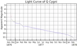 One of the earliest novae recorded,[6] Q Cygni was discovered by astronomer Johann Friedrich Julius Schmidt on November 24, 1876.[7] The star had undergone a nova, brightening to about 3rd magnitude and remaining as bright for four days.[6]
