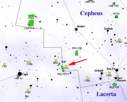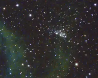 NGC 7510 is an open cluster of stars located around 11,400[2] light years away in the constellation Cepheus, near the border with Cassiopeia.[3] At this distance, the light from the cluster has undergone extinction from interstellar gas and dust equal to E(B – V) = 0.90 ± 0.02 magnitude in the UBV photometric system.[2] Its brightest member is a giant star with a stellar classification of B1.5 III. This cluster forms part of the Perseus Spiral Arm.[4] It has a Trumpler class rating of II 2 m[2] and is around 10 million years old.[3]