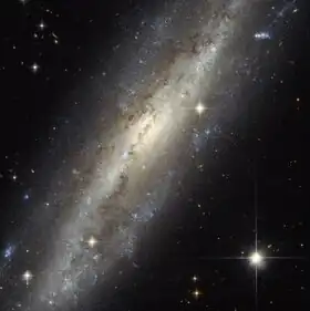 NGC 7640 might not look much like a spiral, but this is due to the orientation (edge on) of the galaxy with respect to an observer on Earth. There is evidence that this galaxy has experienced an interaction with another galaxy in the (astronomically) recent past.[2]