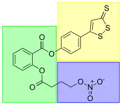 NOSH-Aspirin is a category of new hybrids of acetylsalicylic acid, bearing both nitric oxide (NO)- and hydrogen sulfide (H2S)- releasing areas. Preliminary studies have found that four NOSH variants, evaluated in eleven different human cancer cell lines, were effective in inhibiting the growth of these cell lines. NOSH-1 was also devoid of any cellular toxicity, and was comparable to aspirin in its anti-inflammatory properties.[1][2]