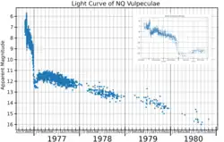 NQ Vulpeculae faded by 3 magnitudes from peak brightness in 65 days, which makes it a "moderate speed" nova. It was one of the first novae to be closely monitored near peak brightness in the infrared.[8] The visual light curve went through a local minimum in January 1977 (resulting in its classification as a DQ Herculis-type nova[9]), and at the same time near infrared (3.5 micron) emission peaked, signalling the formation of a dust shell around the nova.[10] The IRAS satellite was launched a little more than six years after NQ Vulpeculae's outburst, and IRAS detected the nova in the 25, 60 and 100 micron bands.[11]