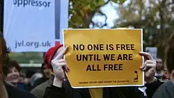 Since October 2023 Na'amod have been engaged with similarly positioned Jewish organisations, such as Jewdas, Jews for Justice for Palestinians, Jewish Voice for Labour, Jewish Socialists' Group[23] as part of the Gaza war protests in the United Kingdom. Internationally, Na'amod has worked alongside IfNotNow and Jews for Racial and Economic Justice.[24]