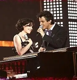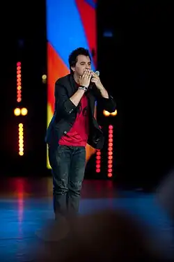 ![]() Nader Guirat winner of Star Academy 5 carrying the Tunisian flag and the trophy on stage at the show's finale on 23 May 2008 | |