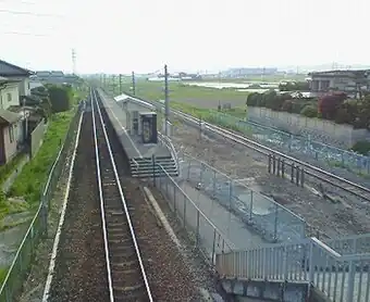 ![]() The station in May 2007 viewed from the Route 104 overpass to the east of the station. The Hachinohe Rinkai Railway lies behind the platform. | |||||||||||