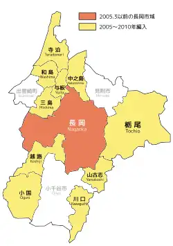 Yellow: 10 former municipalities merged into Nagaoka in the 2000's.