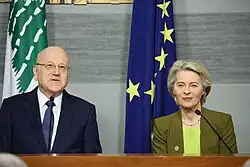 Following the resignation of Prime Minister Hassan Diab in August 2020, both Mustafa Adib and Saad Hariri failed to form a government. Mikati was designated to fill the role on 26 July 2021.[4] He received 72 votes out of 128 MPs.[35] Mikati declared that he wanted a purely technocratic government, without representatives of political parties, in order to carry out the economic reforms expected by Lebanon's donors.[36] His appointment was received coldly by the population. As the country sank into a serious economic, social and humanitarian crisis, he was seen as a representative of the traditional political class and economic elites. According to the daily L'Orient-Le Jour, “if being a billionaire has long been an asset in establishing someone on the Lebanese political scene, it is now perceived by part of the population as a symbol of the plundering of public resources by the political class.[37] On 10 September 2021, Mikati was able to form a government of 24 members after long negotiations with President Aoun, and the various political parties.[38] When he took office, Lebanon was in the grip of a very serious economic crisis: collapse of the national currency, galloping inflation (the cost of food had jumped by 700% in the previous two years), massive layoffs, a poverty rate of 78% according to the UN, frequent power cuts, fuel shortages, etc. He announced that he wanted to call on the solidarity of the Arab world to try to get the country out of the crisis it was going through and to negotiate with the IMF.[39]