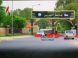 Nahrain University (Arabic: جامعة النهرين), also known as Al-Nahrain University, is a coeducational public university established in 1987 and located in Baghdad, Iraq. The university offers undergraduate and postgraduate education as well as research opportunities. From 1987 to the 2003 Invasion of Iraq, the university was known as Saddam University which was then changed to its current name "Nahrain" meaning The Two Rivers (as in the two rivers of Iraq: Tigris and Euphrates).