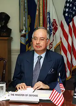 In 1991, Mahathir appointed Najib as Minister of Defence. Under Najib's direction, Malaysian troops were deployed to assist the UN peacekeeping forces in Bosnia in 1993 during the Bosnian War.[47] Malaysian forces were greeted warmly by Bosnians as well as Serbs and Croats.[48] Malaysia also assisted peacekeeping operations in Somalia in 1993, losing one soldier in an effort to aid US soldiers during the Battle of Mogadishu. Najib later criticised the UN's Somalia operation as putting too much emphasis on military action.[49] Since then Malaysia has stated a preference for participating in Chapter 6 "peace enforcement" missions, rather than Chapter 7 "peacekeeping" missions.[50] After four years at the Ministry of Defence, Najib assumed control of the Education Ministry in 1995. He returned to the Ministry of Defence in 2000.[51]