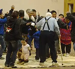 Nalukataq (Inupiaq: [nɐlukɐtɑq], naluk- 'to throw it underhand; to toss it up' + kataq) is the spring whaling festival of the Iñupiat of Northern Alaska, especially the North Slope Borough. It is characterized by its namesake, the dramatic Eskimo blanket toss. "Marking the end of the spring whaling season," Nalukataq creates "a sense of being for the entire community and for all who want a little muktuk or to take part in the blanket toss....At no time, however, does Nalukataq relinquish its original purpose, which is to recognize the annual success and prowess of each umialik, or whaling crew captain....Nalukataq [traditions] have always reflected the process of survival inherent in sharing...crucial to...the Arctic."[1]