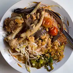This soup is made with noodles; the most commonly used type is khanom chin, fermented rice vermicelli, although kuaitiao or other noodles may be used. Beef or pork is another main ingredient, as well as diced curdled (chicken or pork) blood cake. Chopped tomatoes give the dish a certain sour flavor and crispy roasted or fried dry chilies and garlic are added for spiciness.[3] Another important ingredient that gives the dish its characteristic flavor is thua nao, a type of fermented soy bean that is used extensively in northern Thai cuisine and for which shrimp paste is sometimes used as a substitute. Nam ngiao is often served along with pork rinds.