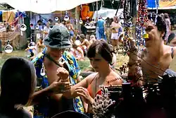 On the Friday night before the 1979 festival was officially opened, the festival 1981 Nambassa Village Market attendance had already reached its maximum capacity. At 3 am Saturday morning Peter was on the phone negotiating paddocks from neighbouring farms, while Fred, Mike and Bernie were out in the dead of night with bolt cutters, removing fences to allow cars and campers into newly acquired festival acreage. By 11 am Saturday morning on opening day, the traffic police closed the festival, and were telling people to go home, announcing on radio that the event could accommodate no more patrons. They ordered the organizers to remove the entry gates to free the roads, as vehicles and pedestrians were banked up in all directions for some 20 kilometres. But still they arrived. Some 5 kilometres towards Waihi a tent city spontaneously arose on a neighbouring farm where approximately 15,000 people parked and then walked the final leg into the festival site. Others abandoned their vehicles in Waihi itself and made the pilgrimage to Nambassa on foot.[24]