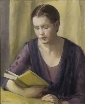 In 1932, when Watson showed recent oil paintings in a solo exhibition at the Kraushaar Galleries on Fifth Avenue in Manhattan, critics, again, took notice. One said she showed "work of the highest quality ... honest, unpretentious, and beautifully 'felt'".[39] Another saw "surety of draftsmanshlp", "fine perception that pierces to the essentials", and "well-related color".[3] A third said "her ability to invest her subjects with charm and grace adds to their integrity as works of art and makes increasingly preposterous the contention held by many of the so-called moderns that to be humanly charming is to lose aesthetic integrity."[40] Edward Alden Jewell, the principal critic for the New York Times commented on Watson's "quiet passion of understanding that gets to the heart of essences".[2] He also called attention to portraits that were, to him, " quite as subtle and gracefully wrought" as the flower paintings. One of these, "Beatrice Reading", is shown above, image no. 2.