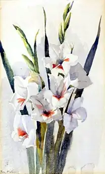 After she had established her primary residence in Manhattan and completed training at the Art Students League of New York and privately with William Merritt Chase, Watson contributed paintings to quite a few group shows at the Whitney Studio Gallery and its successors. Commenting on a 1917 show at the Studio Gallery, a local critic called attention to "a colorful little still life of gladiolus against a blue background".[45] This painting, now owned by the Smithsonian American Art Museum, is shown above, "Untitled (Gladiolus)", image no. 3. Reviewing the same show, another critic found her painting of Robert Barker to be "weak in drawing" but having "quite unusual fineness of color" and another said it had "feeling and intention in color and design".[46][47] Other Whitney group shows took place in 1924, 1925, 1932, 1934, 1935, 1936, 1938, and 1940.[43][48][49] Watson's still life called "Plums" was featured in the catalog for the first Whitney Biennial which opened in November 1932.[50] In 1928, the museum purchased Watson's portrait called "Rose".[51]
