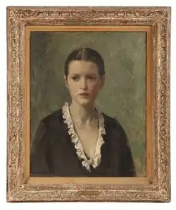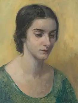 In 1928 and 1931, she showed at the Downtown Galleries in New York and in 1932 in a traveling exhibition sponsored by the College Art Association.[56][57] She participated three times (1932, 1939, and 1940) in shows at the Corcoran Gallery in Washington.[58] In reviewing the first of these, the Evening Post reproduced her portrait entitled "Beatrice" and in reviewing the third the Evening Star reproduced her portrait "Modern Puritan" (shown above, image no. 5).[59][60]