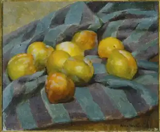 Other group exhibitions included a pair at the Phillips Memorial Gallery (1935 and 1940) and appearances in the Washington Artists' Studio House and the Modern Art Gallery in Washington.[63] Regarding the 1940 Phillips show, Leila Mechlin of the Evening Star wrote that Watson's flower painting and two portraits had "a dash of personality but no stability".[64] Of the same show, a critic for Art News said: "Nan Watson in 'Plums' exhibits a composition of red plums in various stages of ripeness against a violet-striped sky-blue foulard. This oil is fully drawn and painted, as her things usually are."[65] The painting is shown above, image no. 8.