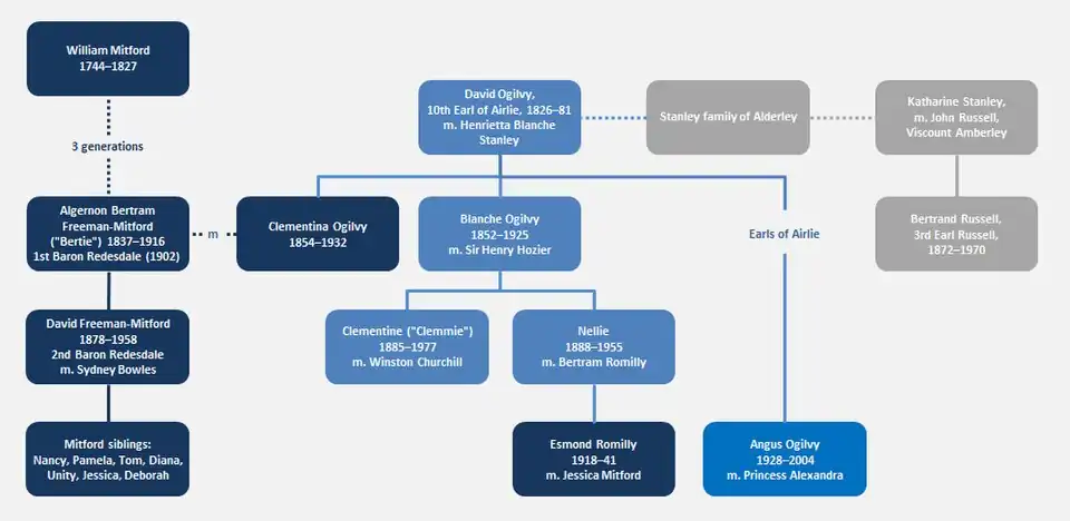 In 1874, he married Clementina, the second daughter of David Ogilvy, 10th Earl of Airlie, a union that linked the Mitfords to some of Britain's most prominent aristocratic families.[7] Blanche Ogilvy, Clementina's elder sister, became the wife of Sir Henry Montague Hozier, a soldier turned businessman. Their four children included daughters Clementine ("Clemmie"), who in 1908 married the future British Prime Minister Winston Churchill, and Nellie, who married Bertram Romilly.[8]