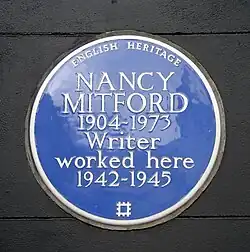 A brief affair with a Free French officer, André Roy, resulted in a third pregnancy. Mitford again miscarried, with complications that led, in November 1941, to a hysterectomy.[89] After convalescence, at loose ends, she began working as an assistant at the Heywood Hill bookshop in Curzon Street.[n 9] The shop became the centre of Mitford's daily activities and was a favoured meeting place for London's literati.[91]