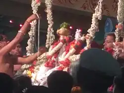 In Thirumazhapadi, Vaidyanathasamy and His consort welcome the group of bridegroom to the accompaniment of music. Then they will be taken to the specially erected wedding mandapa.[5] The marriage festival is held in front of the devotees. After completion of the festival deeparadhana would be done. Later the celestial couples offer blessings. [6] The priests of the temple perform the marriage of Nandhi. As per the marriage ritual the couple would go around the ceremonial fire seven times. Shiva took the newly wed couple to seven Shiva temples around Thiruvaiyaru.[1] These seven temples are known as Saptha Sthanams. They are very close to each other and can be covered in one session. In the tamil month of Chittirai (April-May), the Deity (Utsavar) of Thiruvaiyaru is carried on a palanquin to all these temples.[7]